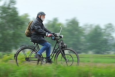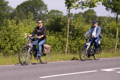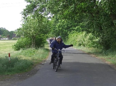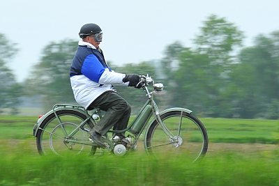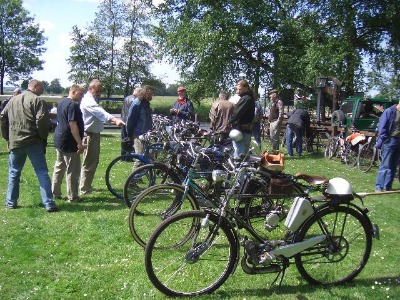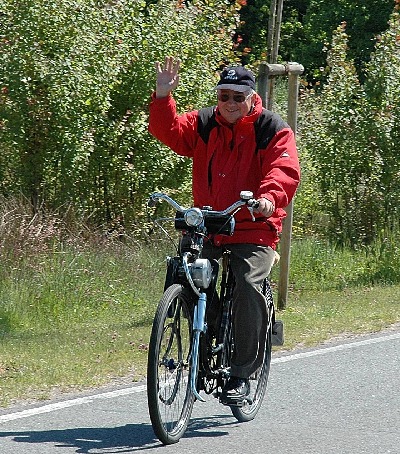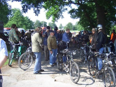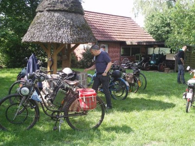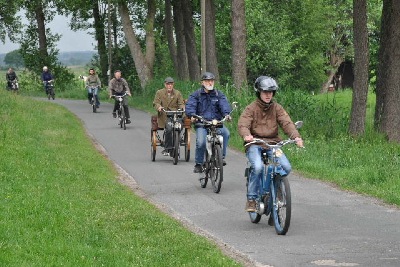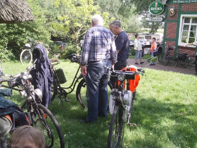 Am Sonntag starteten wir bei bestem Wetter mit knapp 50 geladenen Fahrradhilfsmotorfreunden zur eigentlichen 27. Fahrradhilfsmotor durch das Teufelsmoor. Wir fuhren über Worphausen, Moorende, Seehausen und Tüschendorf ins Tarmstedter Moor, wo jeder –sofern er denn wollte- einen Rundgang um den Moorpfad machen konnte. Dabei kamen die zwei Moorteiche mit den springenden Fröschen und den vielen Libellen sowie der Bienenstock mit den Tausenden von Bienen gut an. Nach der Besichtigung ging es über Adolphsdorf, Otterstein, Neu Mooringen und Worphausen zurück nach Kleinmoor, wo es das Mittagessen gab. Nach dem Mittag ging es einmal durch das St.Jürgensland zur Gaststätte „Wümmeblick“, abschließend nach Kleinmoor zurück, wo wir um 17 Uhr unsere Rundfahrt beenden konnten. Insgesamt gab es nur 3 Ausfälle, wobei eine Panne nicht nur kurios sondern auch amüsant war. Da hat doch tatsächlich eine gelöste Schwungscheibe den Fahrer samt Fahrzeug und andere Teilnehmer buchstäblich mit „Schwung“ überholt...