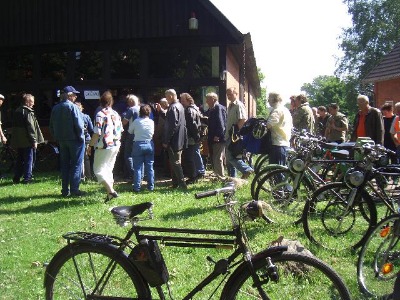 Die Samstag-Ausfahrt führte uns zum Worpsweder Bahnhof, wo wir den Halt des historischen "Moorexpress" erleben durften. Da sehr viele Fahrradhilfsmotorfreunde auch Eisenbahnfans sind, wurde die Fahrt so gelegt, daß es auch mit dem Fahrplan der Bahn paßte. Nach der Ausfahrt gab es den obligatorischen Grillabend. Am Sonntag fuhren wir nach Schlußdorf, wo wir das Torfschiffswerft-Museum besichtigten. Hier waren wir auch bei der ersten Rundfahrt zu Gast.
